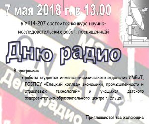 7-го мая в УК14-214 состоится конкурс научно-исследовательских работ, посвященный Дню радио. В программе: работы студентов инженерно-физического отделения ИМЕиТ, ГОБПОУ «Елецкий колледж экономики, промышленности и отраслевых технологий» и ...