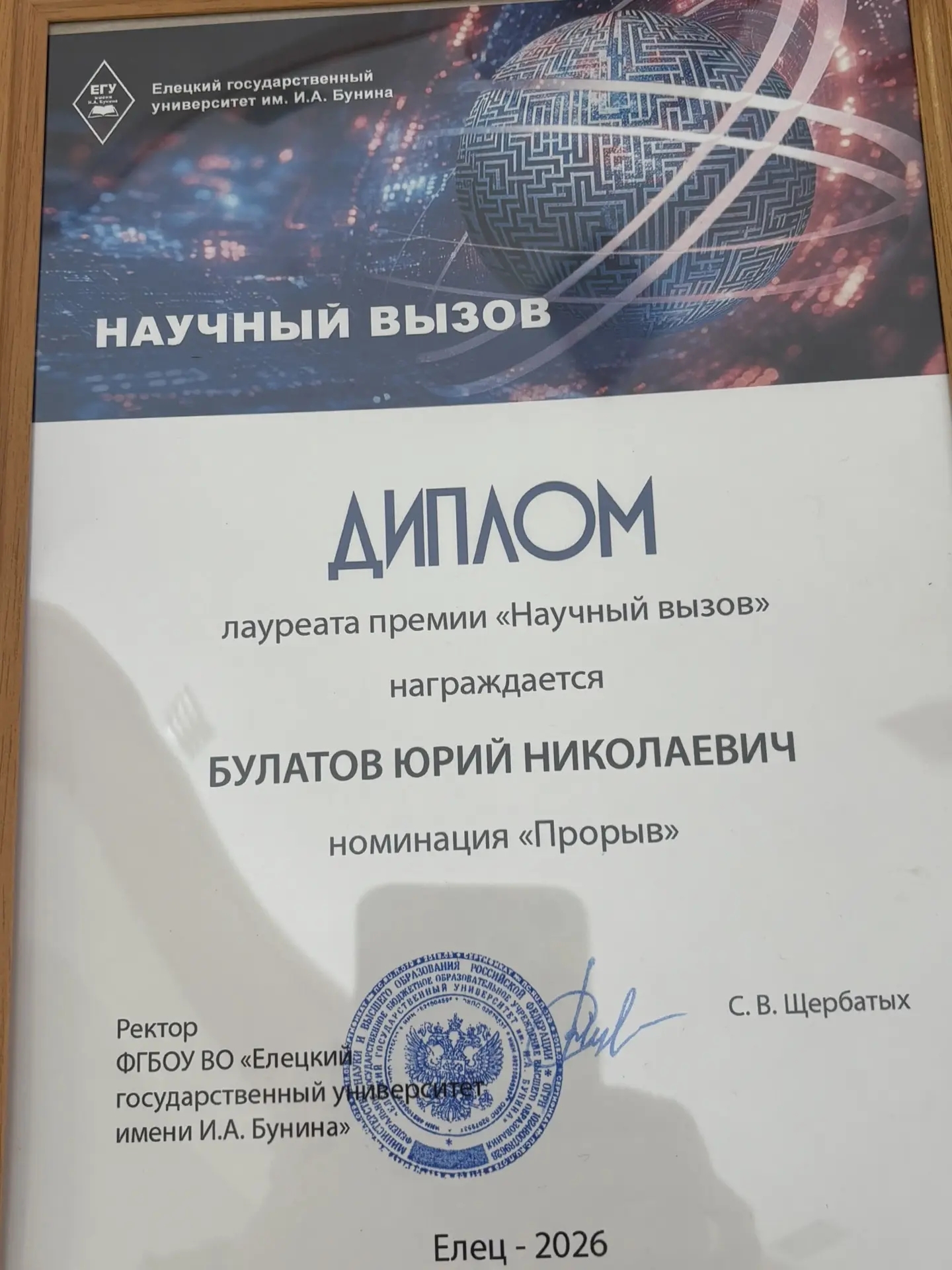 6 февраля в Елецком государственном университете имени И.А. Бунина состоялось торжественное мероприятие, посвящённое Дню российской науки. Оно стало яркой точкой в подведении итогов года, отмеченного значительными успехами в области научных исследований и инноваций. Центральным событием стала церемония вручения университетской премии «Научный вызов». Цель премии — не только отметить выдающиеся заслуги, но и создать среду для поддержки, мотивации и публичного признания учёных, чья деятельность определяет научный авторитет вуза. Номинация «Прорыв» была присуждена кандидату физико-математических наук, старшему преподавателю кафедры математики, информатики, физики и методики обучения Юрию Николаевичу Булатову — за подготовку и защиту первой за последние семь лет кандидатской диссертации по физико-математическим наукам в стенах университета.