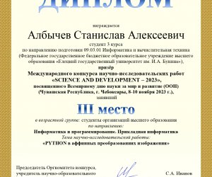 8-10 ноября 2023 г. обучающийся 4 курса института математики, естествознания и техники Албычев Станислав под руководством преподавателей кафедры математического моделирования, компьютерных технологий и информационной безопасности Гнездиловой Н.А. и Самсонова И.Ю. принял участие в Международном конкурсе научно-исследовательских работ «SCIENCE AND DEVELOPMENT – 2023», посвященном Всемирному дню науки за мир и развитие (ООН), по направлению «Информатика и программирование. Прикладная информатика» с темой научно-исследовательской работы «PYTHON в аффинных преобразованиях изображения» и был награжден Дипломом за 3 место. Желаем Албычеву Станиславу и его руководителям дальнейших успехов в научных исследованиях!