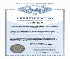 Зайцева Ирина Николаевна, кандидат педагогических наук, доцент кафедры физики, радиотехники и электроники и обучающиеся института математики, естествознания и техники Атаманов Денис Александрович, Меренкова Оксана Владимировна, Сопельняк Алла Владимировна получили свидетельство о государственной регистрации в Роспатенте базы данных «Мультимедийный терминологический словарь в сфере сервиса»